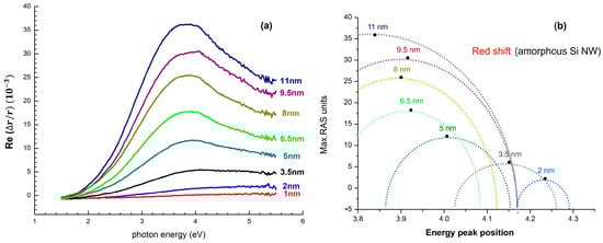 The spectral evolution observed in RAS can be attributed to the combined effects of quantum confinement, strain-induced band-edge modulation, and the amorphous-to-crystalline transition within the silicon nanowires. Quantum confinement alters the joint density of states and transition probabilities, producing measurable shifts in optical anisotropy as the nanowire thickness changes. Interfacial strain further perturbs surface electronic states, modifying the symmetry-dependent dielectric response. Upon annealing, structural ordering narrows the transition bandwidths, resulting in a reversible blue-shift in RAS spectra. These effects are consistent with theoretical models and experimental findings on the optical properties of nanostructured and strained silicon systems [41,42,43,44].