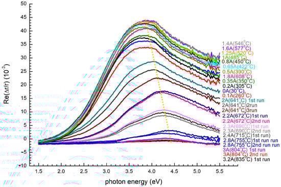 Post-cooldown RAS spectra collected following consecutive annealing plateaus. Below ~485 °C, spectra remain unchanged, forming only hydrogen desorption but no structural reorganization. Between 520 and 640 °C, a significant blue-shift of Et (4.05–4.12 eV) with peak Δr/r ≈ 4.6 × 10−2 evidence SPE and nanowire crystallization. Above ~700 °C, spectra become flattened to a low-intensity baseline, signifying capillary reflow, nanowire coalescence, and irreversible loss of anisotropy.
