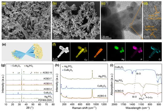 (a) SEM image of CuBi2O4. SEM (b), TEM (c), and HRTEM (d) images of ACBO-5. (e) Schematic diagram of the ACBO-5 sample morphology. (f) Elements mapping of Cu, Bi, Ag, P, and O in ACBO-5. XRD patterns (g), Raman spectra (h), and FTIR spectra (i) of the as-synthesized samples.