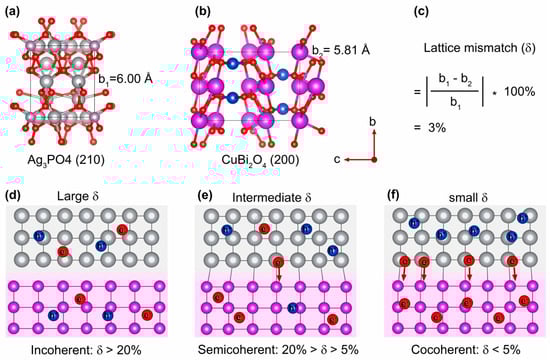 Crystal structures and lattice constants of Ag3PO4 (210) (a) and CuBi2O4 (200) (b). (c) The calculation of interfacial lattice mismatch. Schematic illustration of heterojunctions with large δ (d), intermediate δ (e), and small δ (f).