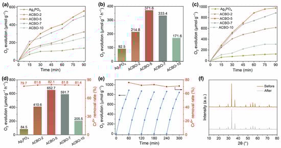(a,b) Photocatalytic oxygen evolution performance of Ag3PO4 and Ag3PO4/CuBi2O4 composite with AgNO3 serving as an electron scavenger. (c,d) Photocatalytic performance of oxygen evolution synchronously with Cr(VI) reduction. (e) Cycling experiment of ACBO-5. (f) XRD patterns of ACBO-5 before and after the cyclic experiment.