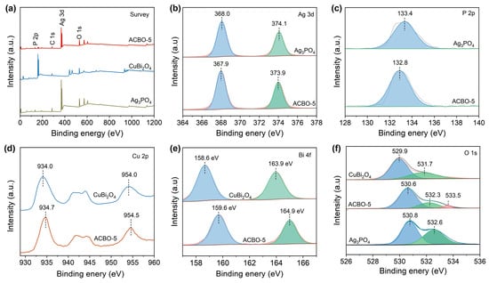 The surface elemental compositions and corresponding chemical valence of Ag3PO4, CuBi2O4, and ACBO-5 were analyzed by XPS. The XPS survey spectrum of the ACBO-5 composite confirms the presence of Ag, P, O, Cu, and Bi elements, thereby providing evidence for the successful coupling of Ag3PO4 and CuBi2O4 (Figure 4a). As shown in Figure 4b, the Ag 3d XPS spectra for Ag3PO4 exhibit two characteristic peaks at 368.0 and 374.1 eV, which are characteristic of Ag 3d5/2 and Ag 3d3/2, respectively, indicating the Ag+ oxidation state. Whereas in the ACBO-5 sample, a slight negative shift of the Ag 3d5/2 and Ag 3d3/2 peaks to 367.9 eV and 373.9 eV, respectively, was observed. The main XPS peak of P 2p is located at 133.4 eV, corresponding to P-O (Figure 4c). Additionally, the ACBO-5 exhibits a more negative binding energy (BE) compared to the Ag3PO4. As depicted in Figure 4d, the Cu 2p core-level spectrum of monomeric CuBi2O4 shows characteristic peaks for Cu 2p1/2 and Cu 2p3/2 at 954.3 and 934.5 eV, respectively. The resulting spin-orbit splitting of 19.8 eV is consistent with the presence of the Cu2+. The other pair of peaks at 940.7 and 943.6 eV was assigned to the satellite peak of Cu2+. In the ACBO-5 sample, the BEs of the Cu 2p core levels showed a negative shift relative to those of CuBi2O4. As shown in Figure 4e, the Bi 4f XPS spectrum of CuBi2O4 reveals two characteristic peaks at 158.6 eV and 163.9 eV, respectively. These spectral features are consistent with the Bi 4f7/2 and Bi 4f5/2, respectively, unequivocally indicating the Bi3+ oxidation state. When coupled with Ag3PO4, the Bi 4f peaks were observed to shift to higher binding energies, specifically to 159.6 eV and 164.9 eV. The O 1s spectrum (Figure 4f) can be deconvoluted into three distinct components at binding energies of 530.6, 532.3, and 533.5 eV, which are assigned to lattice oxygen, surface hydroxyl/adsorbed oxygen species, and oxygen involved in interfacial P-O-Cu bonding, respectively [59,60,61]. Those results above suggest electron accumulation from CuBi2O4 on the surface of Ag3PO4. Moreover, the ACBO material exhibits a lower electron density at the Ag sites, resulting in a more ionic metal–oxygen bond, which may facilitate lattice oxygen activation.