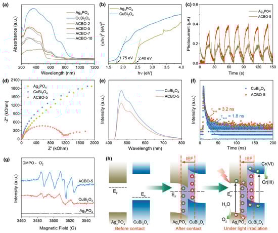 UV-vis DRS (a) of the prepared photocatalysts and the corresponding Tauc plots (b). Transient photocurrent curve density curves (c), EIS Nyquist plots (d), PL spectra (e), and TRPL spectra (f) of the different samples. (g) EPR spectra of DMPO-·O2− over Ag3PO4, CuBi2O4, and ACBO-5. (h) The schematic of the Z-scheme heterojunction before and after hybridization, and under light illumination.