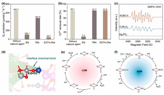 Photocatalytic O2 evolution (a) synchronously with Cr(VI) reduction (b) performance of ACBO-5 under various experimental conditions. (c) In situ EPR spectra of DMPO-·OOH. (d) Schematic diagram of the P-O-Cu interfacial bond formation. Schematic illustration of the LOM (e) and AEM (f) pathway on ACBO-5.