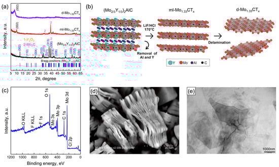 Figure 1a shows the XRD patterns of the (Mo2\3Y1\3)2AlC MAX phase and the multilayer and delaminated Mo1.33CTx MXenes. The (Mo2\3Y1\3)2AlC MAX phase exhibits diffraction peaks at 12.78°, 18.18°, 25.9°, 32.32°, 32.94°, 37.94°, 39.36°, 41.5°, 42.46°, 43.64°, 51.98°, 57.7°, 59.36° and 64.24°, which are assigned to the crystallographic planes (002), (110), (004), (310), (311), (313), (006), (314), (206), (315), (316), (330) and (332), respectively [46]. This confirms the successful formation of the quaternary i-MAX phase, characterized by in-plane chemical ordering of Mo and Y (space group C2/c (#15)). It should also be noted that impurity phases in the form of Y2O3 and Mo2C are present. This is likely due to an oxide film forming on the surface of the metallic yttrium particles. Following the hydrothermal etching of the i-MAX phase in a HCl-LiF mixture, the characteristic diffraction peaks of the i-MAX phase disappear. Additionally, a shift in the (002) diffraction peak from 12.78 to 10.00° was observed. This indicates an increase in the c-lattice parameter. This was due to the successful extraction of weakly bound Al atoms from the i-MAX phase structure. Figure 1a shows the XRD pattern of the delaminated MXene film to confirm the successful delamination. As can be seen, only one diffraction peak (002) is present, and the non-basal diffraction peaks have disappeared. This indicates the successful delamination of MXene [47]. The exfoliation and delamination process of the Mo1.33CTx MXene is shown schematically in Figure 1b. Figure 1c shows the XPS spectrum of the delaminated MXene. As can be seen, the characteristic peaks of Al and Y are absent due to their complete removal during the hydrothermal etching process. The extraction of Y atoms indicates the successful formation of Mo1.33CTx MXene with vacancy ordering [48]. Figure 1d shows an SEM image of multilayer Mo1.33CTx MXene particles. Hydrothermal etching resulted in the formation of accordion-like particles consisting of stacks of loosely bound Mo1.33CTx MXene nanosheets. Following the intercalation of TMA+ ions, the MXenes were successfully delaminated into a single flake, as can be seen in the TEM image (Figure 1e).