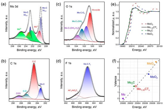High resolution XPS spectra of Mo1.33CTx MXene in the Mo 3d (a), C 1s (b), O 1s (c) and F 1s (d) regions. Normalized XANES spectra of Mo K-edge for MoO2, Mo2C, MoO3, and Mo1.33CTx MXene (e). Fitted chemical valences for the Mo atom in Mo1.33CTx MXene (f).