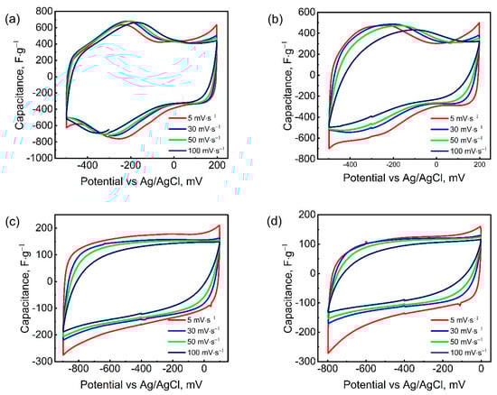 Figure 3 shows the cyclic voltammetry (CV) curves of Mo1.33CTx electrodes in H2SO4, H3PO4, LiCl, and KCl electrolytes. The cyclic voltammetry data presented in Figure 3 correspond to electrode coatings with a mass loading of 1.6 mg·cm−2. For thicker electrode coatings, the CV curves are shown in Figure S3. As can be seen in Figure 3, in acidic H2SO4 and H3PO4 electrolytes, the working potential window ranged from −500 to +200 mV (vs. Ag/AgCl). Further expansion of the potential window beyond 700 mV resulted in electrolyte decomposition. In neutral LiCl and KCl electrolytes, the Mo1.33CTx electrodes exhibited stable capacitive behavior within the potential windows of −900 to +100 mV and -800 to 0 mV, respectively. The CV curves of the acidic electrolytes exhibit a pair of redox peaks: an anodic peak at −0.23 V and a cathodic peak at −0.26 V, indicating the contribution of pseudocapacitance to the charge storage mechanism [49]. This is consistent with previous observations of MXenes in aqueous electrolytes [50]. These redox peaks are likely due to the binding of hydronium ions to the oxygen-containing surface terminals of the Mo1.33CTx electrode, accompanied by a change in the oxidation state of Mo. Notably, the intensity of the redox peaks in the H3PO4 electrolyte was lower than in the H2SO4 electrolyte, despite the similar charge storage mechanism. This is probably due to the conductivity of the electrolytes. The higher conductivity of the H2SO4 electrolyte provides a higher concentration of intercalated hydronium ions, contributing to a more intense electrode reaction. In neutral LiCl and KCl electrolytes, the CV curves were almost rectangular in shape and lacked redox peaks. This behavior is typical of an electric double-layer capacitor (EDLC) [51]. In these cases, the energy storage process involves only the electrostatic adsorption and desorption of electrolyte ions. Although previous studies have shown that MXene stores charge in LiCl electrolyte through pseudocapacitive lithium-ion intercalation—leading to a higher specific capacitance than electric double-layer capacitance [52]—no distinct redox peaks were detected on the CV curves in either LiCl or KCl electrolytes. This suggests that the charge storage likely follows a hybrid mechanism, combining both electric double-layer capacitance and pseudocapacitance.
