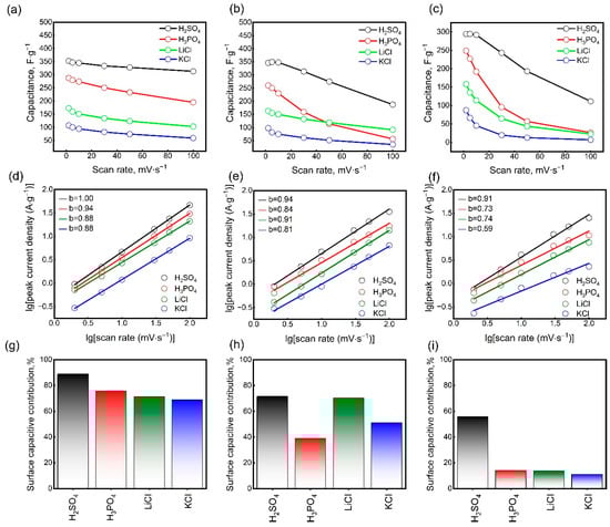 Figure 4d–f show the dependence of the logarithm of the peak current CV on the logarithm of the scan rate for electrodes of different thicknesses. To explain the kinetics of charge accumulation in the electrodes, the parameter b in Equation (3) was determined from the slope of the fitted lines. As can be seen in Figure 4d–f, the b parameter for the electrodes with a mass loading of 1.6 mg∙cm−2 was 1.00, 0.94, 0.88, and 0.88 for the H2SO4, H3PO4, LiCl, and KCl electrolytes, respectively. Values of b close to 1 imply a surface-capacitive charge accumulation mechanism, which is dominant in the acidic electrolytes. For the LiCl and KCl electrolytes, the b values between 0.5 and 1 suggest a hybrid energy storage mechanism, combining capacitive and diffusion-controlled processes. As the mass loading of the electrodes increased, the b values gradually decreased in all cases. This confirms the growing role of diffusion processes in charge accumulation. Additionally, a transition to a mechanism controlled entirely by diffusion processes was observed for electrodes with a mass loading of 5.3 mg∙cm−2 in a KCl electrolyte.