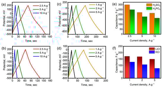 GCD curves for Mo1.33CTx in H2SO4 (a), H3PO4 (b), LiCl (c), and KCl (d) electrolytes. Specific capacitance at various current densities in different electrolytes (H2SO4 and H3PO4 (e), LiCl and KCl (f)).