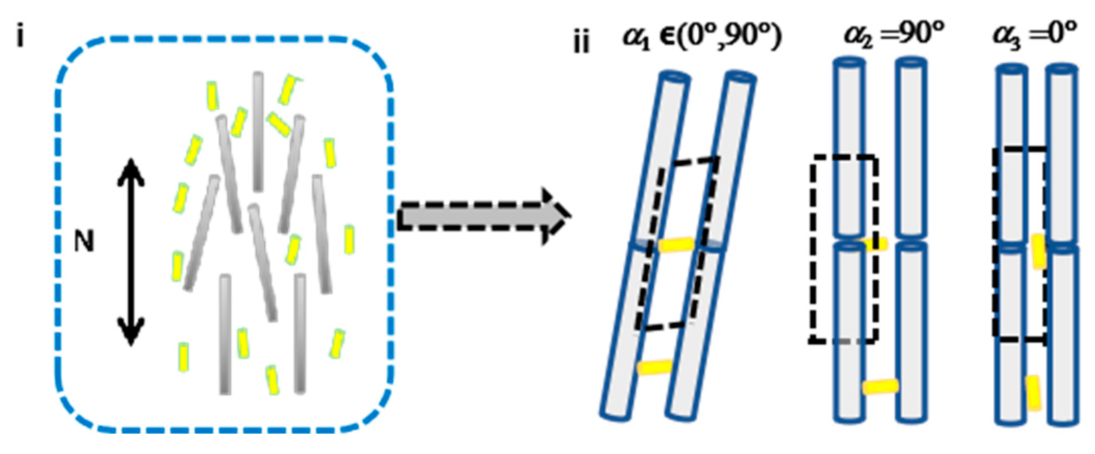 Figure 3 presents a schematic illustration of the excluded volume in the composite NR–CNC system. Figure 3i shows the composite structure in which NRs are embedded within the uniaxially nematic CNC LC, while Figure 3ii depicts the corresponding unit schematic. In Figure 3i, the yellow and silver rods represent the added NRs and CNCs, respectively, and the black arrow indicates the director (N) of the uniaxial nematic ordering of CNCs. Figure 3ii illustrates that the black dashed quadrilateral denotes the excluded volume of the unit cell, and the angle between the CNC and NR orientations reflects the effect of their mutual alignment. Additionally, Figure 3ii shows NR–CNC unit schematics at different relative orientation angles.