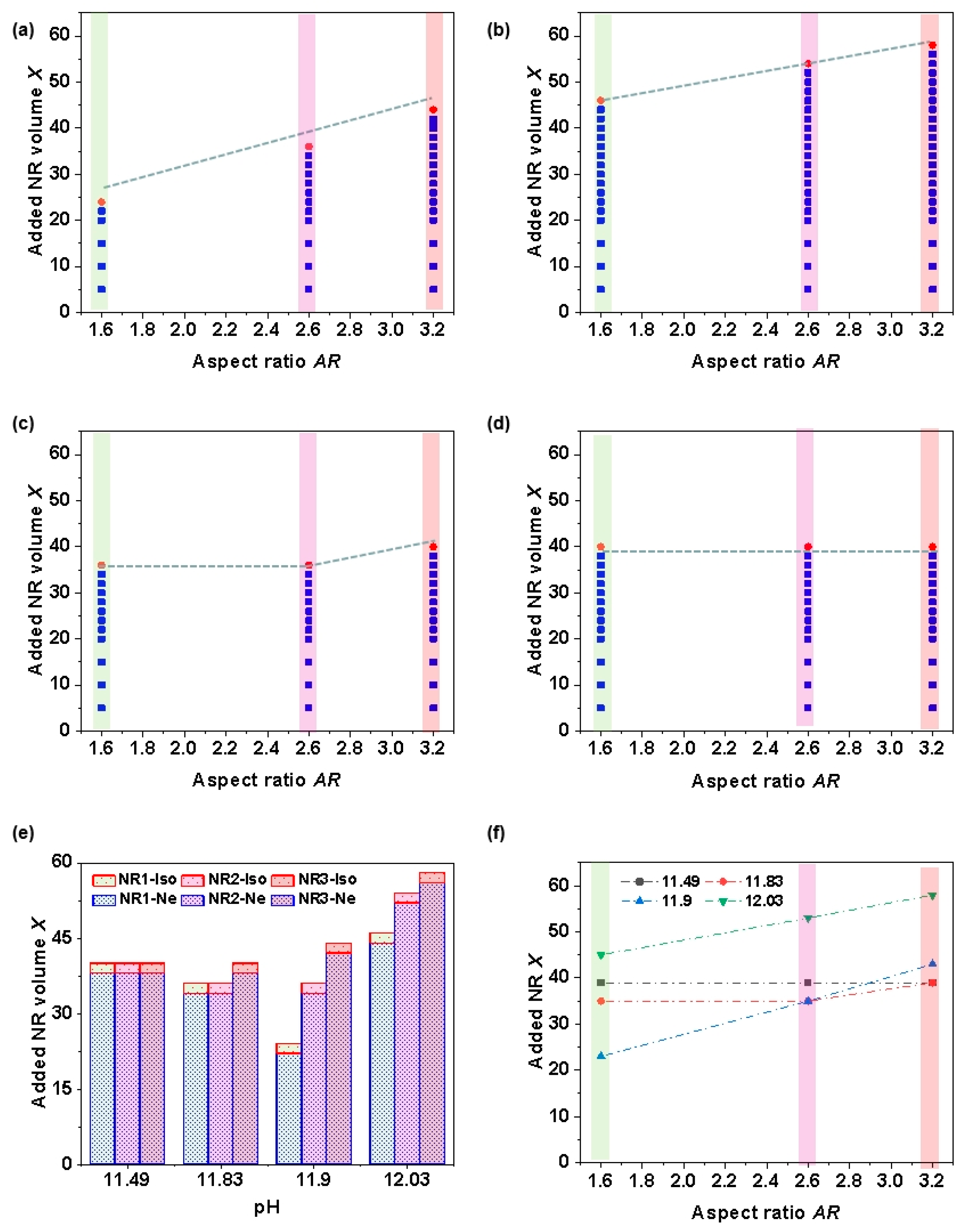 Figure 5. (ad) Phase diagram of composite NR–CNC systems at different pH values: (a) pH = 11.9, (b) pH = 12.03, (c) pH = 11.83, and (d) pH = 11.49. Red spheres and blue squares represent the isotropic and uniaxial nematic phases, respectively. (e) Phase diagram of composite NR–CNC systems as a function of pH and NR aspect ratio. (f) Phase transitions between the uniaxial nematic and isotropic phases, highlighting the effects of aspect ratio and pH.