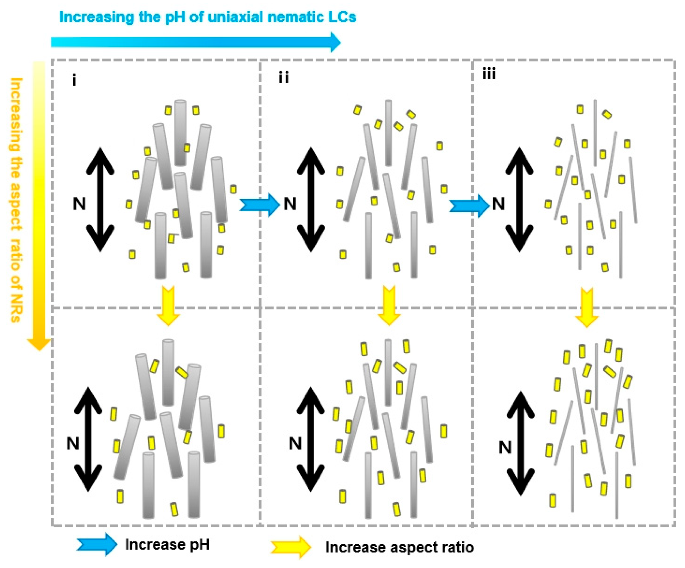 Figure 7 illustrates schematic representations of the composite NR–uniaxial nematic CNC systems as a function of increasing CNC pH and NR aspect ratio. Figure 7i–iii show the trend of increasing pH (indicated by blue arrows), while the first and second rows represent the trend of increasing aspect ratio (indicated by yellow arrows).
