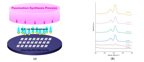 - Seok, H.; Megra, Y.T.; Kanade, C.K.; Cho, J.; Kanade, V.K.; Kim, M.; Lee, I.; Yoo, P.J.; Kim, H.U.; Suk, J.W.; et al. Low-Temperature Synthesis of Wafer-Scale MoS-WS Vertical Heterostructures by Single-Step Penetrative Plasma Sulfurization. ACS Nano 2021, 15, 707–718. [Google Scholar] [CrossRef]