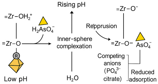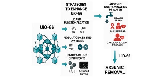 −1, depending on synthesis and surface chemistry. Optimal adsorption occurs within pH 4–8, while high salinity or competing anions reduce performance by 15–40%. UiO-66 materials demonstrate excellent regeneration efficiency (70–95%) after multiple cycles, with limited metal leaching (1–3%). Advances through ligand functionalization, modulator-assisted synthesis, and composite integration have significantly improved adsorption capacity, selectivity, and reusability. However, challenges persist in achieving green, water-based synthesis, maintaining long-term stability under realistic water chemistries, and enabling scalable production. Future work should focus on eco-friendly fabrication, defect engineering, and mechanistic optimization to fully harness UiO-66’s potential as a high-performance and sustainable adsorbent for arsenic-contaminated water treatment.