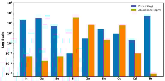 Cu2ZnSn(S,Se)4 (CZTSSe)-based solar cells have garnered increasing attention in recent years as a sustainable and cost-effective alternative to conventional thin-film photovoltaic technologies [1,2,3,4,5,6,7]. The use of earth-abundant and low-toxicity elements [8,9,10,11] and favorable optoelectronic properties—such as a tunable direct bandgap (ranging from approximately 1.0 eV to 1.5 eV, or even up to 1.9 eV by alloying) [12] and strong light absorption (with coefficients typically exceeding 104 cm−1) in CZTSSe solar cells—make them a compelling choice in the global push toward cleaner energy solutions and addressing climate change. As shown in Figure 1, CZTSSe combines high elemental abundance with low material cost, making it favorable compared to CdTe and CIGS.