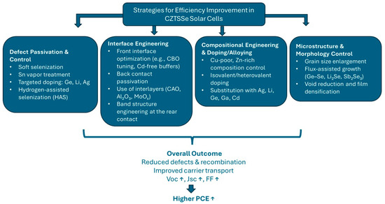 Recent improvement in CZTSSe solar cell efficiency has been realized using various synergistic approaches pointing to the challenges. Most important ones can be arranged as defect passivation and control, interface optimization, compositional engineering, and microstructural improvements. The following sections examine these strategies in detail, beginning with approaches to control bulk and interfacial defects, key contributors to the open-circuit voltage (VOC) deficit in CZTSSe solar cells. A schematic overview of these efficiency improvement strategies is provided in Figure 7, highlighting four major categories: defect passivation, interface optimization, compositional engineering, and microstructural improvements.