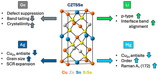 Schematic illustration of isovalent and alkali metal doping in CZTSSe absorbers. Ge substitutes Sn sites, suppressing Sn2+ formation and reducing band tailing. Li substitutes Zn, creating shallow acceptors and enhancing p-type conductivity and interface alignment. Ag substitutes Cu, raising the formation energy of CuZn antisites, reducing recombination, and promoting grain growth. Mg substitutes Zn, suppressing antisite defects, improving cation ordering, and enhancing the Raman A1(172) mode. Arrows next to physical parameters (↑/↓) indicate increase or decrease, whereas large colored arrows represent the direction of dopant influence in the schematic.