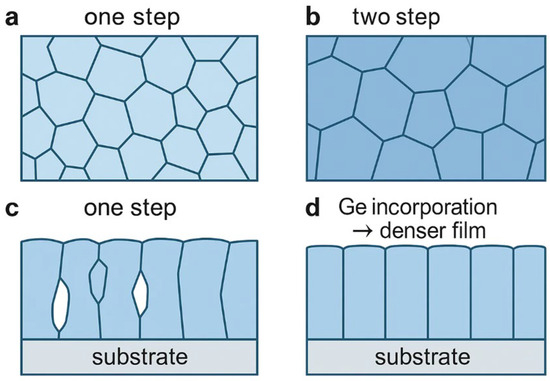 Ge doping also reduces the activation energy of CuZn-related defects (from ~157 to ~112 meV), decreases the Urbach energy (EU), and promotes grain growth, producing denser absorber layers with smoother morphology [110,111]. Additionally, Ge promotes grain growth, producing absorber layers that are denser and smoother [110,111].