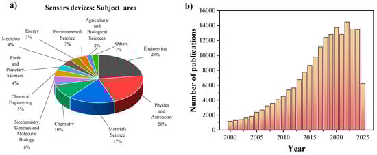 Research articles related to “Sensor/Sensors” devices categorized by (a) subject areas and (b) year of publication from 2010 to 2025 (Source: Scopus and Web of Science databases).