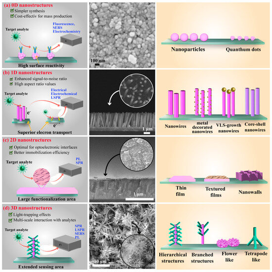 Figure 5 presents a comparative overview of the main ZnO nanostructure types (0D, 1D, 2D, and 3D), displaying representative SEM micrographs along with their corresponding synthesis advantages and functional benefits for sensing applications. A concise yet comprehensive discussion of the main physicochemical features and typical uses associated with each morphology is provided, emphasizing how dimensionality and structural design influence the performance of ZnO nanomaterials in biosensing systems.