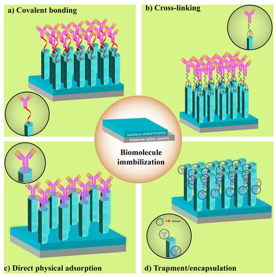 Schematic representation of immobilization strategies for target biomolecules on 1D ZnO nanostructures: (a) covalent bonding, (b) cross-linking, (c) direct physical adsorption, and (d) entrapment/encapsulation approaches.