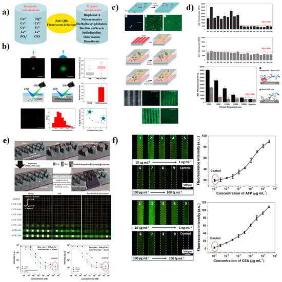 - Sang, C.H.; Chou, S.J.; Pan, F.M.; Sheu, J.T. Fluorescence Enhancement and Multiple Protein Detection in ZnO Nanostructure Microfluidic Devices. Biosens. Bioelectron. 2016, 75, 285–292. [Google Scholar] [CrossRef]