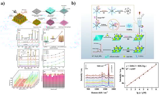 - Zhang, H.; Huang, S.; Yang, X.; Yuan, R.; Chai, Y. A SERS Biosensor Constructed by Calcined ZnO Substrate with High-Efficiency Charge Transfer for Sensitive Detection of Pb2+. Sens. Actuators B Chem. 2021, 343, 130142. [Google Scholar] [CrossRef]