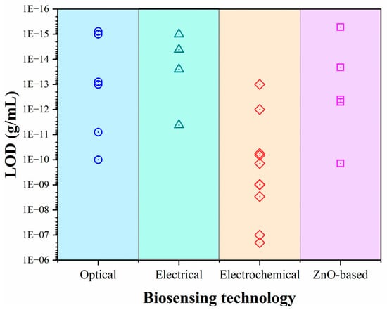 In another study, anti-immunoglobulin G (anti-IgG) antibodies conjugated with AuNPs were immobilized via direct adsorption onto ZnONWs synthesized through wet-chemical routes. The resulting biosensor exhibited a linear correlation between the piezoelectric response and anti-IgG concentration within the range of 10−7–10−3 g mL−1, achieving a limit of detection (LOD) of 6.9 ng mL−1 [102].