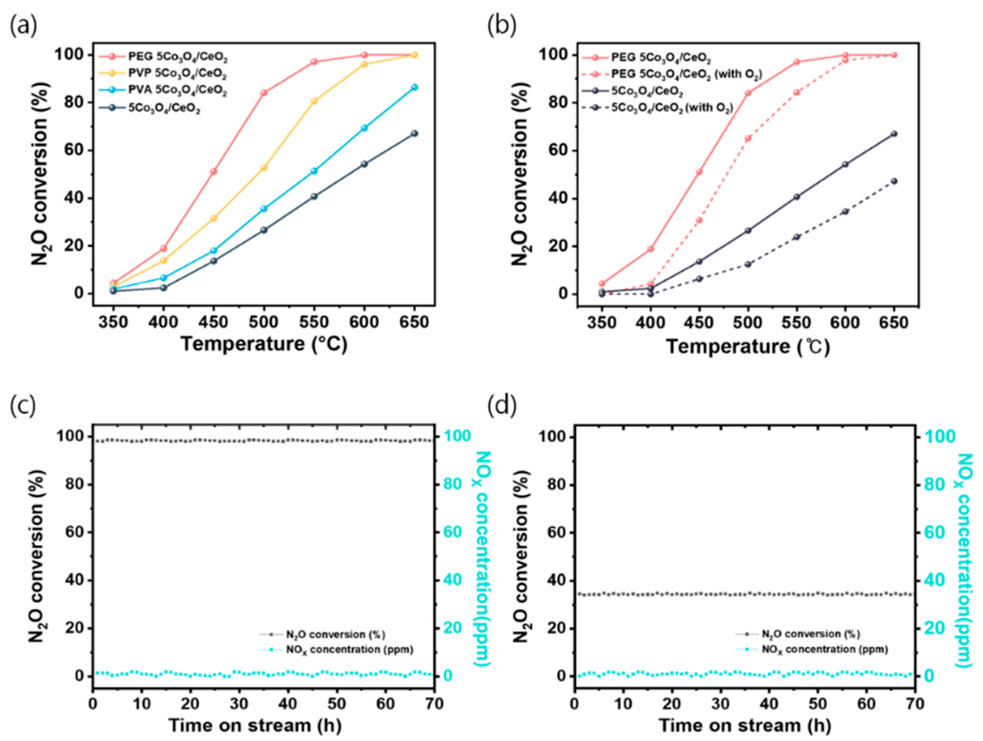 - Li, S.; Zhao, J.; Song, Z.; Wang, H.; Zhang, T.; Liu, J.; Jiang, Q. New insights into the effect of polyvinyl alcohol on Co3O4 spinel oxide catalyst for N2O decomposition. Fuel 2024, 362, 130745. [Google Scholar] [CrossRef]