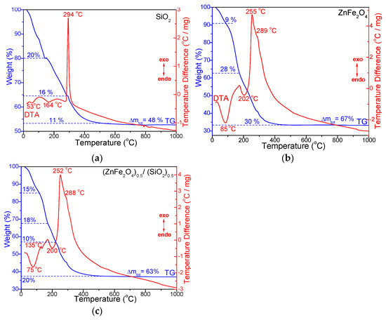 Figure 2 shows the TG–DTA curves of (a) SiO2, (b) 50%ZnFe2O4/50%SiO2, and (c) ZnFe2O4 non-embedded in SiO2. The SiO2 sample exhibits two endothermic effects at 53 °C and 164 °C, corresponding to a ~20% mass loss, attributed to the removal of adsorbed water, condensation reactions, and the elimination of unbound 1,4-butanediol [18,27,28]. A pronounced exothermic peak at 294 °C indicates the combustion of organic chains chemically bound into the SiO2 matrix [18,27]. The bulk ZnFe2O4 sample decomposes in four distinct steps: (i) an endothermic peak at 85 °C (~9% mass loss), associated with the release of crystallization water and residual moisture; (ii) an endothermic peak at 202 °C (~28% mass loss), associated with the formation of Zn2+ and Fe3+ succinates via a redox reaction between the corresponding nitrates and 1,4-butanediol; and (iii) two successive exothermic peaks at 255 °C and 289 °C (~30% total mass loss), corresponding to the decomposition of Zn2+ and Fe3+ succinates into amorphous ZnO and Fe2O3. The intermediate oxides subsequently react in situ to form the ZnFe2O4 spinel phase [16,17,18,27,28].