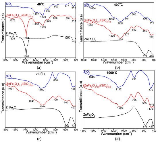 FT-IR spectra of SiO2, (ZnFe2O4)0.5/(SiO2)0.5 and ZnFe2O4 heat treated at 40 °C (a) and annealed at 400 °C (b), 700 °C (c), and 1000 °C (d).