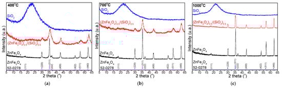At all temperatures, the XRD pattern of SiO2 (Figure 4) displays a broad amorphous halo between 15 and 25° 2θ, characteristic of its amorphous structure, with no crystalline phases of the SiO2 matrix identified. At 400 °C (Figure 4a), the (ZnFe2O4)0.5/(SiO2)0.5 displays broad, low-intensity reflections corresponding to ZnFe2O4, indicating incomplete crystallization, reduced crystallite size, and the dilution effect caused by the amorphous SiO2 matrix. In contrast, pure ZnFe2O4 exhibits distinct diffraction peaks indexed to the (111), (220), (311), (400), and (511) planes, consistent with the spinel structure (JCPDS No. 52-0278) [28]. The sharper and more intense peaks observed in the pure phase suggest larger crystallite sizes compared to the ZnFe2O4 embedded in the SiO2 matrix.