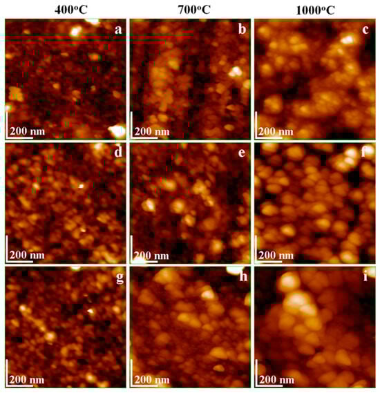 The uniformly adsorbed small nanoparticles, such as SiO2 and (ZnFe2O4)0.5/(SiO2)0.5 annealed at 400 °C (Figure 6d,g), form smooth thin films, with surface roughness ranging from 3.15 to 5.10 nm, as reported in Table 2. In contrast, the nanoclusters present in the ZnFe2O4 sample annealed at 400 °C (Figure 6a) lead to an increased surface roughness of 4.01 nm due to ferrite crystallite coalescence, which induces protrusions causing localized height variations. Thus, amorphous SiO2 acts as a refining agent of nanostructure. Surface roughness further increases progressively with the development of larger, well-individualized nanoparticles formed after annealing at 700 and 1000 °C. Thus, the (ZnFe2O4)0.5/(SiO2)0.5 thin film exhibits the highest roughness, as observed in Figure 6i. This variation in surface roughness plays a critical role in the performance of ferrite thin films in technological applications, including sustainable energy and biomechanical energy conversion [7,33].