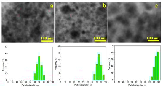 The samples were randomly dispersed on the TEM grid, to ensure a representative imaging. Ferrite particles and the ferrite core within the composite appear in regions of intense dark contrast, while amorphous SiO2 particles and coating surrounding of the composite particles appear in intense grey contrast. Pure ferrite particles (Figure 8a) are well individualized with a high coalescence tendency. The particle size distribution analysis reveals a mean size of 70 nm. Both clusters and well individualized particles of amorphous SiO2 are observed in Figure 8b. The particle size distribution reveals a mean value of 85 nm, which is comparable to that of the composite particles being situated at 100 nm, consistent with the AFM measurements.