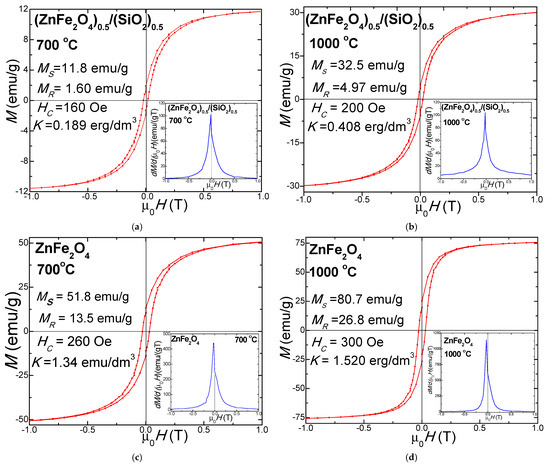 The hysteresis loops of (ZnFe2O4)0.5/(SiO2)0.5 and pure ZnFe2O4 annealed at 700 °C and 1000 °C are shown in Figure 9. The key magnetic parameters, including saturation magnetization (MS), remanent magnetization (MR), coercivity (Hc), and crystalline anisotropy constant (K), were extracted from these curves. The results reveal notable differences between the pure and embedded ZnFe2O4, highlighting the influence of the non-magnetic matrix on the overall magnetic behavior. These differences further emphasize that the magnetic properties of the nanoparticles are strongly dependent on their crystallinity and morphology [1,11]. Smaller nanoparticles typically exhibit superparamagnetic behavior, as thermal energy is sufficient to overcome their magnetic anisotropy energy barriers. In contrast, larger particles, particularly those with a higher Zn2+ content in the spinel lattice, tend to display ferromagnetic behavior, whereas bulk ZnFe2O4 remains paramagnetic at room temperature [1,11]. The ZnFe2O4 nanoparticles embedded in the SiO2 matrix demonstrate reduced magnetic properties compared to uncoated ZnFe2O4 reported in previous studies. This attenuation is primarily attributed to an increased surface defect density and magnetic dilution effects, both of which are influenced by the synthesis conditions and the presence of the non-magnetic SiO2 layer [1,11].