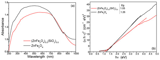 (a) UV–Vis absorbance spectra and (b) Tauc’s plot of ZnFe2O4, (ZnFe2O4)0.5/(SiO2)0.5, and SiO2 annealed at 1000 ° C.