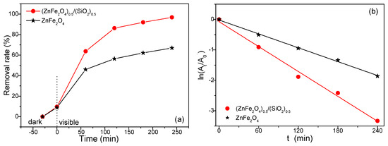 Removal rate of RhB under visible-light irradiation (a) and photodegradation kinetic of ZnFe2O4, (ZnFe2O4)0.5/(SiO2)0.5, and SiO2 annealed at 1000 °C (b).