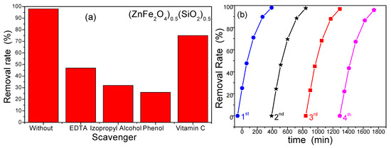 The effect of scavengers on the RhB degradation (a) and the reusability of the (ZnFe2O4)0.5(SiO2)0.5 nanocomposite used in the removal experiments (b).
