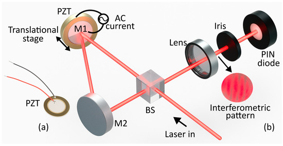 The displacement caused by the piezoelectric effect under AC excitation was measured using a modified Sagnac interferometer (Figure 1b). A 638 nm, 4.8 mW continuous-wave laser, Thorlabs Inc., Newton, NJ, USA, was divided by a beam splitter, and both beams were reflected by mirrors (M1 and M2) along equal path lengths to create an interference pattern. The pattern was then filtered with an iris to reduce noise and detected by a FDS100 photodiode, Thorlabs Inc., Newton, NJ, USA. The electrical signal was recorded using an oscilloscope model 2190E, B&K Precision Co., Yorba Linda, CA, USA, in AC configuration to measure changes in the interferometric fringe displacement and remove DC components. The piezoelectric sensor was mounted behind M1, and a 5 Vp variable-frequency AC source was used for excitation. Mirror displacement—calibrated via a micrometric stage—was detected as fringe variations, correlating optical signals with mechanical deformation. Each measurement was repeated ten times per sample.