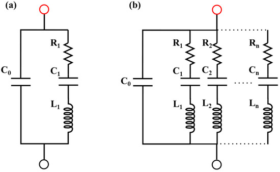where Z(s) is the equivalent impedance of the piezoelectric device, computed as the parallel of C0 with the series of L1, C1, and R1. Since the sample behaves as a resonant medium that supports harmonic frequencies determined by its geometry, several resonances are present in the electrical response. To model the normal modes of vibration can be considered an additional parallel RLC circuit can be included for each harmonic mode. A more complete equivalent circuit is shown in Figure 2b.