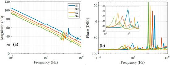 The electrical-impedance characterization of the four piezoelectric devices is shown in Figure 4 as a Bode diagram. The impedance magnitude, computed as , exhibits the typical piezoelectric resonance and antiresonance features [20], as shown in Figure 4a. The magnitude curves have similar slopes but different phases, associated with the global capacitance of the devices, which scales proportionally with the electrode area. Additionally, strong resonances are observed near 105 Hz, which increase in frequency as the device diameter decreases. Figure 4b shows the corresponding phase diagram, revealing that the resonance peaks shift to lower frequencies for larger devices. The main resonance peaks occur at 182 kHz, 138 kHz, 100 kHz, and 79.5 kHz for the S1, S2, S3, and S4 devices, respectively. Moreover, resonant peaks in the audible range also exhibit a monotonic frequency shift, appearing at 9.5 kHz, 5.5 kHz, 3.5 kHz, and 2.4 kHz for the same sequence of devices. These resonance behaviors were subsequently used to analyze electromechanical characteristics and to propose potential engineering applications.