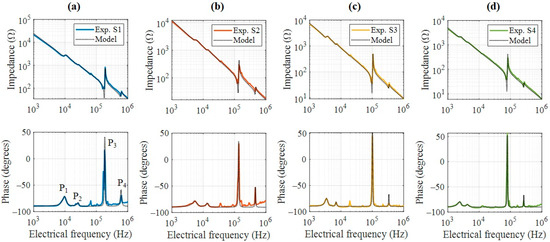Bode plot of the piezoelectric devices and its numerical model. (a) S1, (b) S2, (c) S3, and (d) S4 samples.