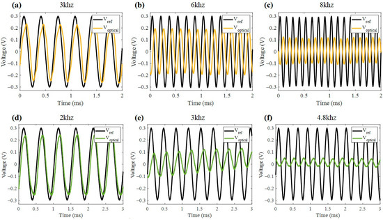 Building on the previous findings, the strain response of the piezoelectric devices was measured using the modified Sagnac interferometer (Figure 1b), which was previously calibrated to establish a quantitative relationship between optical fringe displacement and mechanical deformation. The interferometric calibration (performed using a micrometrical translational stage in mirror M1) provided a sensitivity of 20 µm/V, corresponding to the displacement measured by the photodiode. Each volt at the detector output represents an equivalent mirror displacement of 20 µm, while the actual driving voltage applied to the PZT remained within the linear regime. Subsequently, measurements were performed on two commercial PZT devices excited with an AC voltage signal swept across the acoustic frequency range (1 kHz to 10 kHz). For each sample, the interferometric setup recorded the dynamic displacement induced by the piezoelectric activation, allowing the extraction of strain information from the modulated interference fringes. Figure 6 shows the dynamic results of some representative frequencies specific to device S3 (Figure 6a–c) and S4 (Figure 6d–f). As a reference, the AC input voltage signal (Vref) applied to the electrodes is presented alongside the corresponding optical signal (Voptical) detected in AC mode, which reflects the real-time deformation of the devices. The optical response shows clear frequency dependence, with maximum deformation occurring near the first mechanical resonance, in agreement with the impedance spectroscopy results.