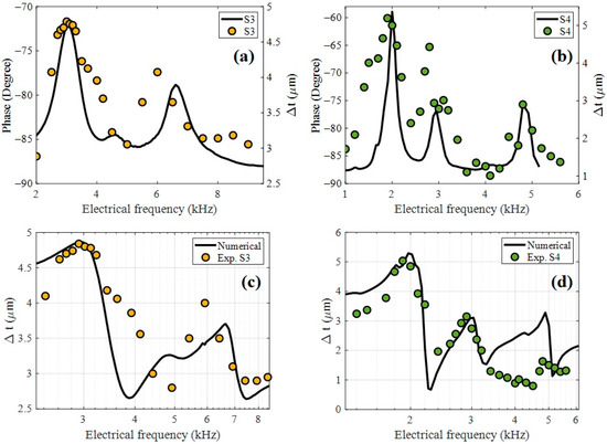 Figure 7a and Figure 7b present a comparative analysis between the impedance phase response and the interferometric strain measurements in samples S3 and S4, respectively. These results reveal a strong correlation, particularly in the acoustic frequency range. The maximum deformation Δt recorded by the interferometer (right axis) coincided with the frequency where the impedance phase exhibits a rapid transition, typically near the resonance peak. This behavior is consistent with the physical principle that, at resonance, the electromechanical coupling is maximized [28], leading to a peak in mechanical displacement and a characteristic phase shift in the electrical response. Furthermore, Figure 7c,d show the interferometric results compared with a numerical approximation based on a simplified electromechanical model of the device. The model shows good agreement with the experimental data, particularly around the dominant resonance frequency, validating both the optical calibration setup and the applicability of the equivalent circuit model for predicting dynamic strain behavior in frequency-mode operation. The piezoelectric coefficient d33 was estimated by correlating the measured strain amplitude with the model of Equations (8) and (9). The best fit to the data yielded a value of , which is in the range of the typical reported values for granular PZT ceramics [29,30] and lower than those of dense bulk materials. This result confirms the sensitivity and reliability of the combined interferometric-electrical approach for quantitatively characterizing frequency mode-piezoelectricity.