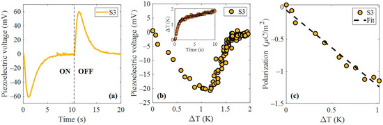 Piezo-optical response by kHz nanosecond laser source. (a) Piezoelectrical voltage induced by 15 kHz at 82 mW power in sample S3. (b) Pyroelectric effect in sample S3 by photothermal process. (c) Induced polarization by pyroelectric effect.