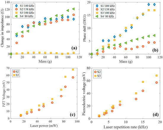 Devices implemented as frequency-mode mass balances. (a) Change in impedance and (b) phase shift. Piezo-optical voltage in samples S2 and S3 as a function of (c) laser power and (d) laser repetition rate.