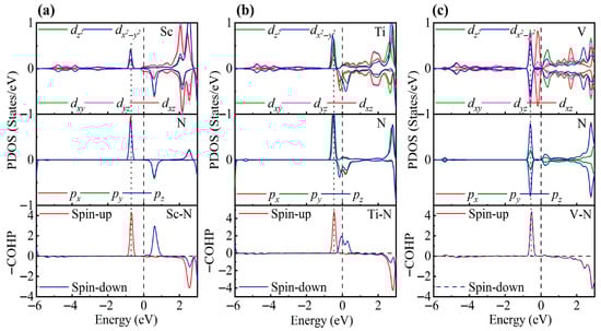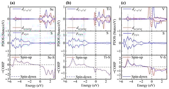 PDOS and COHP of (a) Sc-, (b) Ti-, and (c) V-decorated ZrS2 monolayers. DOS showing orbital degeneracy between TM dxy/dyz/dxz and S px/py/pz orbitals, as well as additional degeneracy of and orbitals below the Fermi level.