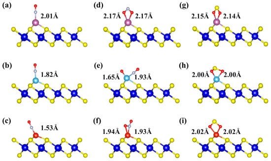 The most stable adsorption structures of three gases on Sc-, Ti-, and V-decorated ZrS2 monolayers: (a–c) NO adsorption on Sc-, Ti-, and V-ZrS2, respectively; (d–f) NO2 adsorption on Sc-, Ti-, and V-ZrS2, respectively; and (g–i) SO2 adsorption on Sc-, Ti-, and V-ZrS2, respectively.