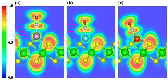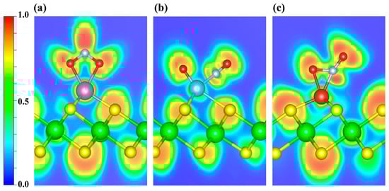 ELF distributions of NO adsorbed on (a) Sc-, (b) Ti-, and (c) V-decorated ZrS2 systems. The plots highlight the ELF features around the adsorption sites. Blue and red denote ELF values of 0 and 1, respectively.