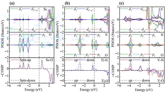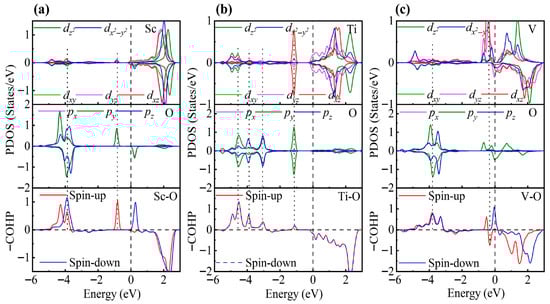 The PDOS and COHP analyses further support this conclusion (Figure 9). In the Sc-modified system, a pronounced hybridization between Sc d and O py orbitals is observed at −0.86 eV, corresponding to a spin-up bonding state, while at −3.90 eV, Sc d and O p orbitals also exhibit significant hybridization, forming both spin-up and spin-down bonding states. The absence of notable antibonding states near the Fermi level ensures the stability of adsorption. In the Ti-modified system, Ti t2g orbitals hybridize with O p orbitals at −1.05 eV, and stronger Ti d-O p hybridizations are observed at −3.08 eV, −3.91 eV, and −4.45 eV, with the largest COHP area at −4.45 eV. Despite the presence of weak antibonding states near the Fermi level, the bonding states dominate, resulting in strong adsorption. In contrast, the V-modified system exhibits pronounced occupation of antibonding states near the Fermi level, mainly involving t2g orbitals, with the strongest V d-O p hybridization at −3.82 eV. The increased d-electron count reduces the covalent contribution, explaining the significantly lower adsorption energy compared to the Sc- and Ti-modified systems.